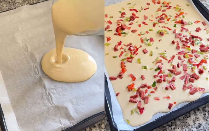Pre nego što započnete sa slaganjem, podmažite posudu za pečenje uljem. Na dno stavite sloj pečenih paprika, zatim dodajte sloj pripremljenog mesa sa lukom. Preko ovog sloja prelijte polovinu smjese jaja i vrhnja. Ovaj postupak ponavljajte dok ne dođete do posljednjeg sloja paprika, na koji prelijete ostatak mješavine jaja i vrhnja. Ako želite dodatno obogatiti okus, možete posuti naribanim sirom ili sjemenkama sezama na vrhu, što će stvoriti lijepu hrskavu koricu tokom pečenja.