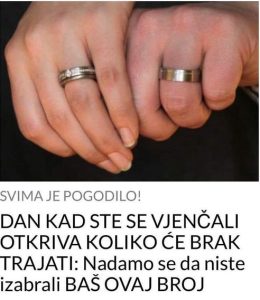 - Proces je jednostavan. Sve što treba uraditi jeste zbrojiti sve znamenke iz datuma vjenčanja i svesti ih na jednocifreni broj. Na primjer, ako je neko vjenčanje bilo 12.6.1999, sabiranjem brojeva 1+2+6+1+9+9+9 dolazimo do 37. Daljim sabiranjem 3+7 dobijemo 10, pa zatim 1+0, što nam daje konačan broj – jedan.