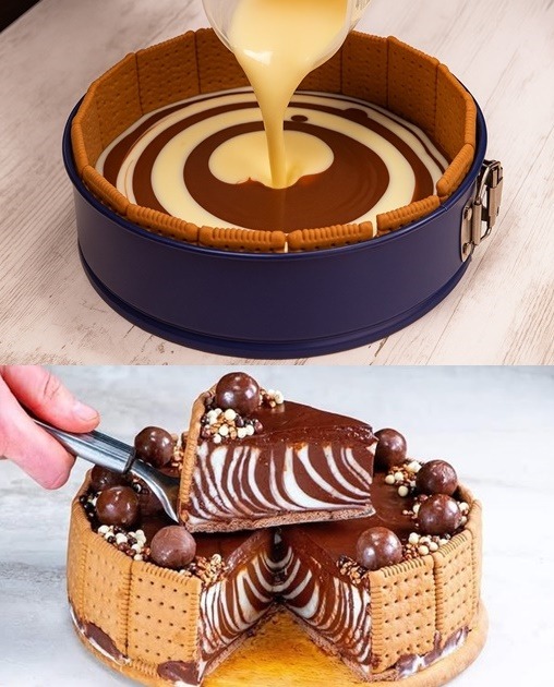 Za pripremu bijelog fila, ponovite postupak, ali bez dodavanja kakaa. Naizmjenično ulijevajte slojeve oba nadjeva u kalup, pazeći da zadržite vidljivost krugova. Ovaj višeslojni pristup dodaje vizualnu privlačnost i raznolikost u okusu. Kada potrošite sav nadjev, stavite kalup u hladnjak da se ohladi otprilike sat vremena. Ovaj korak je važan za učvršćivanje nadjeva i osiguranje da se svi okusi sjedine. Nakon što se torta ohladi, pripremite se za sljedeći korak.