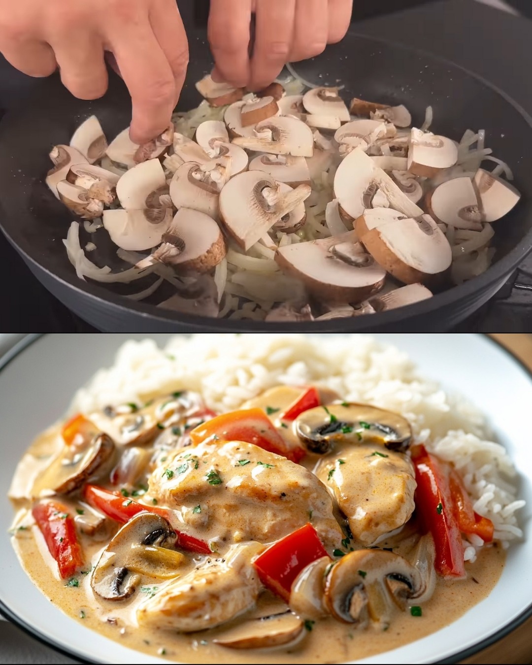 Nakon što su pečeni, izvadite ih iz tiganja i ostavite sa strane. U istom tiganju dodajte ljutiku, sitno sjeckani češnjak, gljive i crvenu papriku. Pržite povrće dok ne omekša i ne zamiriše, što će trajati otprilike 5 minuta. Ova faza je ključna jer karamelizacija povrća dodatno obogaćuje ukus jela. Nakon toga, dodajte vrhnje za šlag u tiganj, začinite solju, paprom i paprikom, i vratite pileće filete u tiganj. Smanjite vatru, poklopite i pustite da se kuha još 15-20 minuta, ili dok piletina ne postane potpuno kuhana.