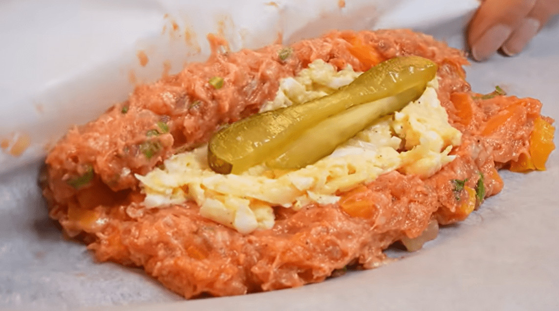 5. Formiranje rolica: Na papiru za pečenje, oblikujte mesnu smjesu u pravokutnik debljine oko 1,2 cm. Ravnomjerno rasporedite nadjev od sira, ostavljajući rubove slobodne. Na sredinu stavite narezane kisele krastavce. Ovaj korak dodaje svježinu i dodatnu hrskavost.