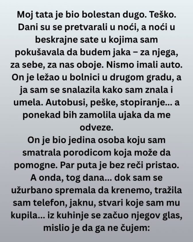 Moj otac je bolovao dugo, predugo. Danima i noćima borio se s bolešću koja mu je neumoljivo oduzimala snagu. Ja sam bila tu – ne kao posmatrač, već kao neko ko se trudio da ostane čvrst stub u svetu koji se rušio. Sva odgovornost pala je na mene. Nismo imali auto. Bolnica u kojoj je ležao nalazila se u drugom gradu, a ja sam svakodnevno pronalazila načine da budem uz njega. Vozila bih se autobusima, išla peške, ponekad stopirala, a kad više nisam imala snage ni za to, zvala sam ujaka da nas poveze.