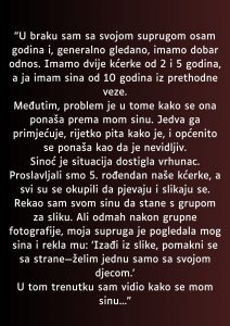 Otac primjećuje da njegova supruga sve više zanemaruje njegovog sina, koji ima samo deset godina. Ovaj osjećaj nepostojanja stvara duboku emocionalnu bol ne samo u srcu djeteta, već i u srcu oca koji se bori da održi jedinstvo unutar porodice. Kada su se nedavno okupili za proslavu petog rođendana njihove kćerke, situacija je dosegla vrhunac. Iako je to trebao biti trenutak sreće, trenutak zajedništva, supruga mu je rekla da sin izadje iz porodične slike jer želi fotografiju samo sa svojom decom. Ovaj incident nije samo trenutak neugode; on simbolizira dublje probleme u dinamici porodice. Dječak, koji je već pretrpio gubitak biološke majke, sada se suočava s dodatnom boli i izolacijom. Ovaj osjećaj gubitka podrške i ljubavi može imati dugoročne posljedice na njegov emocionalni razvoj. Istraživanje pokazuje da djeca koja odrastaju u okruženju gdje se ne osjećaju prihvaćenima mogu razviti niz emocionalnih i psiholoških problema, uključujući anksioznost, depresiju i nisku samopouzdanje.