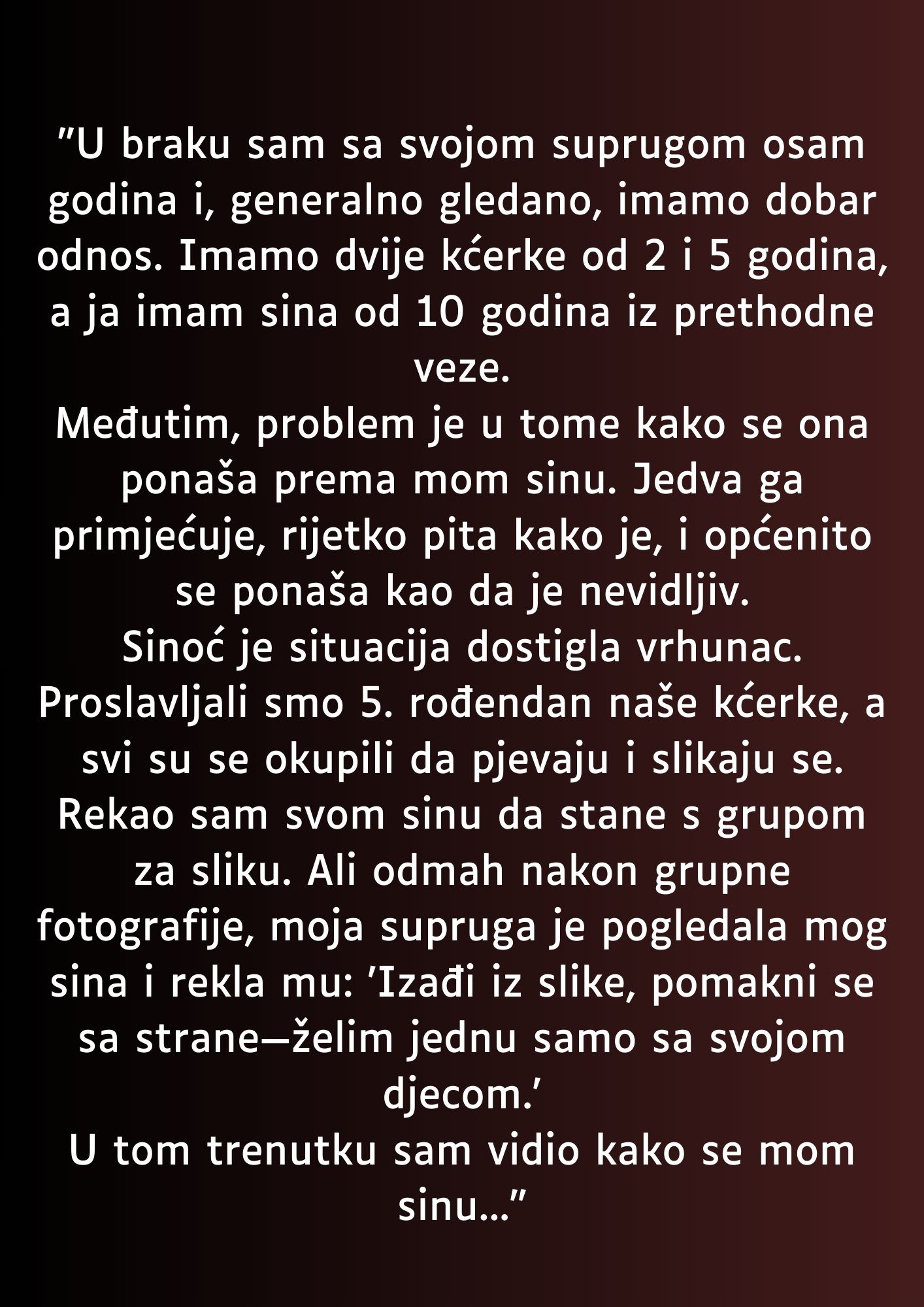 Otac primjećuje da njegova supruga sve više zanemaruje njegovog sina, koji ima samo deset godina. Ovaj osjećaj nepostojanja stvara duboku emocionalnu bol ne samo u srcu djeteta, već i u srcu oca koji se bori da održi jedinstvo unutar porodice. Kada su se nedavno okupili za proslavu petog rođendana njihove kćerke, situacija je dosegla vrhunac. Iako je to trebao biti trenutak sreće, trenutak zajedništva, supruga mu je rekla da sin izadje iz porodične slike jer želi fotografiju samo sa svojom decom. Ovaj incident nije samo trenutak neugode; on simbolizira dublje probleme u dinamici porodice. Dječak, koji je već pretrpio gubitak biološke majke, sada se suočava s dodatnom boli i izolacijom. Ovaj osjećaj gubitka podrške i ljubavi može imati dugoročne posljedice na njegov emocionalni razvoj. Istraživanje pokazuje da djeca koja odrastaju u okruženju gdje se ne osjećaju prihvaćenima mogu razviti niz emocionalnih i psiholoških problema, uključujući anksioznost, depresiju i nisku samopouzdanje.