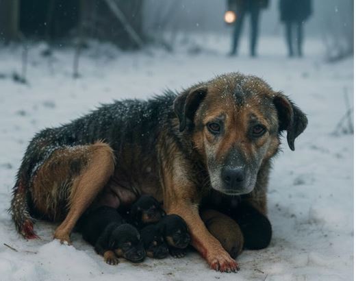 Na rubu malog sela, u skrivenoj dolini, nalazio se pas. Njena sudbina nije bila laka, ali njena snaga bila je neizmjerna. Ispod nje, u maloj gnjezdu od snijega, ležalo je četiri malena štenca, bezbrižna i mirna, zaštićena od hladnoće i opasnosti koje su vrebale iz noći. Njihova majka, unatoč iscrpljenosti i bolovima, pružala im je neizmernu ljubav, štiteći ih od svih nedaća. Ova slika majčinske ljubavi bila je suprotnost snažnom zimskom okruženju koje se nalazilo oko njih.